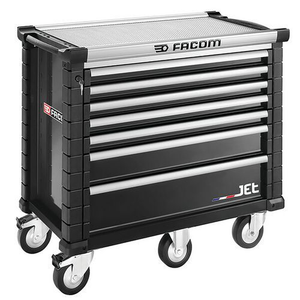 Gereedschapswagen JETM5 met 7 laden geschikt voor 30 modules, met een nuttig opbergvolume van 255 l. Houten plank van 15 mm, afgedekt met een aluminium plateau met ‘rijstkorrel’-finish van 2 mm. Maximaal toelaatbare belasting 1100 kg. De uiteinden zijn van polypropyleen bestand tegen stoten en koolwaterstoffen. Met een speciale opbergmogelijkheid voor 3 schroevendraaiers. Handgrepen met een zachte coating van twee materialen, aan beide zijden geïntegreerd in de gereedschapswagen voor betere hanteerbaarheid bij het verplaatsen en optillen bij obstakels. Laden met ergonomische handgrepen van corrosiebestendig aluminium.