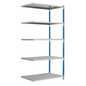 Gesloten stelling van plaatstaal Combi-Flip, Max. belasting per legbord: 200 kg, Hoogte: 2000 mm, Aantal legborden: 5, Type legbord: Massief, Breedte: 1000 mm, Diepte: 500 mm, Coating: Epoxy, Type element: Aanbouw, Legbord materiaal: Staal, Kleur juk: Blauw, Kleur staander: Blauw, Legbord kleur: Lichtgrijs, RAL: 5015 7035, Stelling voor: Losse onderdelen, Configureerbaar: ja, Stelling lijn: Combi-Flip, Afstand verstelbaarheid: 62.5 mm, Max. belasting: 1000 kg, Montage: Zelfbouw, Aantal niveaus: 5, Staaldikte staander: 1.5 mm, Staander materiaal: Staal, Frame materiaal: Staal, Montagesysteem: Système d'accrochage, Staander breedte: 40 mm, Aantal jukken: 1, Aantal kruisschoren: 0, Afstand: 62.5 mm, Type juk: Open, Aantal staanders: 2, Dikte legbord: 32 mm, Type stelling: Lichte stelling, Geen gereedschap nodig: ja, Staaldikte legbord: 0.8 mm, Dekra: ja