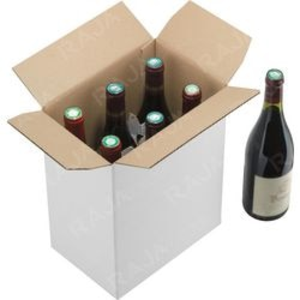 RAJA flesverzenddoos. Materiaal: karton. Voor 6 flessen, met interne scheiding. Externe afmetingen: 262 x 179 x 306 mm. Interne afmetingen: 256 x 173 x 296 mm. Platte afmetingen: 389 x 434 mm.