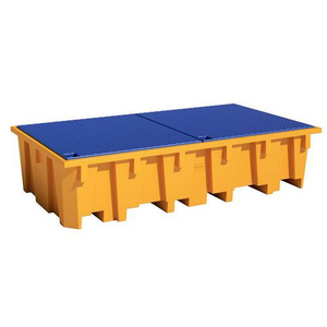 Opvangbak voor 2 IBC, Inhoud opvangbak: 1330 L, Kleur: Geel, Capaciteit (aantal bulkcontainers): 2, Totale breedte: 1300 mm, Totale hoogte: 575 mm, Totale lengte: 2680 mm, Rooster materiaal: Kunststof, Roostermat: ja, Materiaal: Polyethyleen, Recyclebare verpakking: Ja - 100%, Recyclebaar product: Ja - 100%