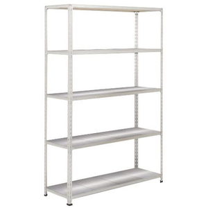 Middelzware stelling Manutan Rapid 2, Max. belasting per legbord: 280 kg, Legbord materiaal: Staal, Hoogte: 1980 mm, Aantal legborden: 5, Type legbord: Massief, Breedte: 1220 mm, Diepte: 455 mm, Coating: Verzinkt, Type element: Zelfstandig, Model: Rapid 2, Type juk: Open, Aantal niveaus: 5, Kleur staander: Zilver/verzinkt, Kleur ligger: Zilver/verzinkt, Legbord kleur: Zilver/verzinkt, RAL: 7001, Stelling voor: Losse onderdelen, Configureerbaar: ja, Stelling lijn: Manutan Rapid 2, Afstand verstelbaarheid: 38.1 mm, Montage: Zelfbouw, Frame materiaal: Staal, Montagesysteem: Bevestigingssysteem, Aantal staanders: 4, Type stelling: Halfzware stelling, Geen gereedschap nodig: ja