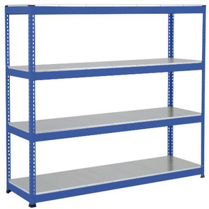 Zware stelling Manutan Rapid 1, Legbord materiaal: Staal, Hoogte: 1980 mm, Aantal niveaus: 4, Aantal legborden: 4, Type legbord: Massief, Breedte: 2440 mm, Diepte: 610 mm, Coating: Epoxy, Type element: Zelfstandig, Max. belasting per niveau: 250 kg, Kleur juk: Blauw, Kleur staander: Blauw, Kleur ligger: Blauw, Legbord kleur: Zilver/verzinkt, RAL: 5019, Stelling voor: Losse onderdelen, Configureerbaar: ja, Stelling lijn: Manutan Rapid 1, Max. belasting: 750 kg, Montage: Zelfbouw, Ligger materiaal: Staal, Staaldikte staander: 2 mm, Frame materiaal: Staal, Ligger breedte: 2440 mm, Aantal liggers: 8, Aantal jukken: 2, Dikte legbord: 11 mm, Type stelling: Zwaarlast stelling, Geen gereedschap nodig: ja