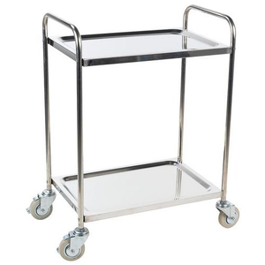 Rvs wagen, Max. belasting: 100 kg, Totale hoogte: 900 mm, Totale breedte: 415 mm, Totale lengte: 660 mm, Aantal plateaus: 2, Nuttige lengte plateau: 570 mm, Nuttige breedte plateau: 365 mm, Dikte tafelblad: 0.65 mm, Hoogte tussen 2 plateaus: 610 mm, Max. belasting per afdekplaat: 50 kg, Type wiel: Zwenkwielen, Wiel loopvlak: Thermoplastisch elastomeer, Zwenkwiel Ø: 100 mm, Onderstel materiaal: Rvs, Special Covid-19: nee, Plateau materiaal: Rvs, Gewicht: 11.1 kg, Frame kleur: Grijs