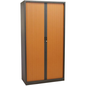 Roldeurkast hoog tweekleurig, Totale hoogte: 195 cm, Totale breedte: 100 cm, Deur openingstype: Met roldeur, Kleur deur: Kersenhout, Kleur ombouw: Antraciet, Totale diepte: 45.7 cm, Aantal legborden: 4, Model: Hoge kast, Max. belasting per legbord: 45 kg, RAL: 7016, Meubellijn: Manutan Orel, Geleverd gemonteerd: ja, Materiaal: Metaal, kunststof, Recyclebare verpakking: Ja - 100%, Gerecyclede verpakkingen: 100 %, Recyclebaar product: Ja - 100%, Gerecycled product: 20 %, Deurmateriaal: PVC, Type sluiting: Met sleutel, Brandveiligheid: M1