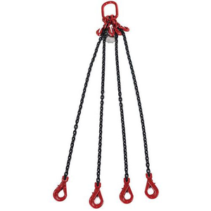 Hijsband met ketting, 4 strengen, hefvermogen 2360 kg. Van staal bestand tegen warmte en kou, type grade 80. Veiligheidscoëfficiënt 4 met breukbelasting van 9440 kg, norm EN818-4. Haak met automatische sluiting voor extra veiligheid.