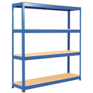 Zware stelling Manutan Rapid 1, Legbord materiaal: Spaanplaat, Hoogte: 1980 mm, Aantal niveaus: 4, Aantal legborden: 4, Type legbord: Massief, Breedte: 1830 mm, Diepte: 455 mm, Coating: Epoxy, Type element: Zelfstandig, Max. belasting per niveau: 610 kg, Kleur staander: Blauw, Kleur ligger: Blauw, RAL: 5019, Stelling voor: Zware voorwerpen, Configureerbaar: ja, Stelling lijn: Manutan Rapid 1, Max. belasting: 2440 kg, Montage: Zelfbouw, Materiaal: Staal, Ligger materiaal: Staal, Staaldikte staander: 2 mm, Gerecyclede verpakkingen: 9 %, Gerecycled product: 9 %, Frame materiaal: Staal, Ligger breedte: 1830 mm, Aantal liggers: 8, Aantal jukken: 2, Dikte legbord: 15 mm, Type stelling: Zwaarlast stelling, Geen gereedschap nodig: ja