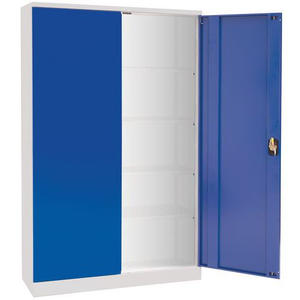 Werkkast in kit, Max. belasting: 240 kg, Materiaal: Staal, Totale hoogte: 1950 mm, Totale breedte: 915 mm, Aantal legborden: 4, Totale diepte: 421 mm, Frame kleur: Grijs, Kleur deur: Blauw, Type: Hoge kast, Type sluiting: Met sleutel, Max. belasting per legbord: 60 kg, Aantal laden: 0, Aantal deuren: 2, Kleur: Blauw/grijs, RAL: 7035 5010, Met lade: nee, Geleverd gemonteerd: nee, Montage: Zelfbouw, Nuttige hoogte: 1810 mm, Nuttige breedte: 910 mm, Recyclebare verpakking: Ja - 100%, Gerecyclede verpakkingen: 100 %, Recyclebaar product: Ja - 100%, Gerecycled product: 20 %, Deurmateriaal: Staal, Nuttige diepte: 350 mm, Frame materiaal: Staal, Deur RAL: 5010