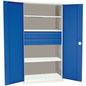 Hoge werkplaatskast Magic, Max. belasting: 250 kg, Materiaal: Staal, Totale hoogte: 1950 mm, Aantal laden: 2, Totale breedte: 1000 mm, Totale diepte: 450 mm, Frame kleur: Grijs, Lade kleur: Blauw, Kleur deur: Blauw, Type: Hoge kast, Model: Zonder tussenwand, Aantal legborden: 3, RAL: 7035 5010, Geleverd gemonteerd: ja, Max. belasting per legbord: 60 kg, Max. belasting per lade: 100 kg, Nuttige hoogte: 175 cm, Nuttige breedte: 900 mm, Recyclebare verpakking: Ja - 100%, Gerecyclede verpakkingen: 100 %, Recyclebaar product: Ja - 100%, Gerecycled product: 20 %, Nuttige diepte: 390 mm, Hoogte lade: 155 mm
