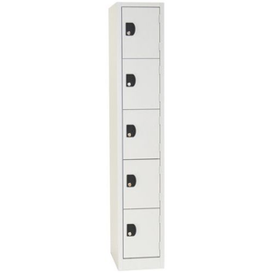 Meervakse garderobekast met vakken Modulo, Type garderobekast: Met vakken, Materiaal: Staal, Aantal vakken/kolom: 5, Aantal kastkolommen: 1, Onderstel: Op sokkel, Breedte kolom: 300 mm, Type sluiting: Met sleutel, Hoogte: 1800 mm, Breedte: 315 mm, Diepte: 500 mm, Plaatstaal dikte: 7/10de, Nuttige hoogte vak: 316 mm, Nuttige breedte vak: 297 mm, Nuttige diepte vak: 470 mm, Coating: Epoxy, Kleur ombouw: Lichtgrijs, Kleur deur: Lichtgrijs, RAL: 7035, Configureerbaar: ja, Geleverd gemonteerd: ja, Materiaal: Staalplaat, Special Covid-19: nee, Recyclebare verpakking: Ja - 100%, Gerecyclede verpakkingen: 100 %, Recyclebaar product: Ja - 100%, Gerecycled product: 20 %