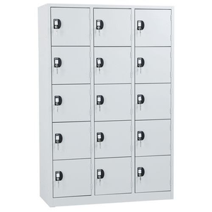 Meervakse garderobekast met vakken Modulo, Type garderobekast: Met vakken, Materiaal: Staal, Aantal vakken/kolom: 5 (speciaal voor helmen), Aantal kastkolommen: 3, Onderstel: Op sokkel, Breedte kolom: 400 mm, Type sluiting: Met sleutel, Hoogte: 1800 mm, Breedte: 1185 mm, Diepte: 500 mm, Plaatstaal dikte: 7/10de, Nuttige hoogte vak: 315 mm, Nuttige breedte vak: 335 mm, Nuttige diepte vak: 475 mm, Coating: Epoxy, Kleur ombouw: Lichtgrijs, Kleur deur: Lichtgrijs, RAL: 7035, Configureerbaar: ja, Geleverd gemonteerd: ja, Materiaal: Staalplaat, Special Covid-19: nee, Recyclebare verpakking: Ja - 100%, Gerecyclede verpakkingen: 100 %, Recyclebaar product: Ja - 100%, Gerecycled product: 20 %