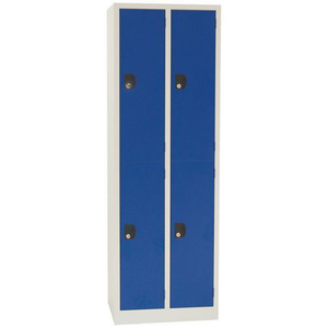 Meervaks garderobekast met hanggedeelte Modulo, Type garderobekast: Met garderobe, Materiaal: Staal, Aantal vakken/kolom: 2, Aantal kastkolommen: 2, Onderstel: Op sokkel, Breedte kolom: 300 mm, Type sluiting: Met sleutel, Hoogte: 1800 mm, Breedte: 600 mm, Diepte: 500 mm, Plaatstaal dikte: 7/10de, Nuttige hoogte vak: 820 mm, Nuttige breedte vak: 235 mm, Nuttige diepte vak: 475 mm, Coating: Epoxy, Kleur ombouw: Grijs, Kleur deur: Blauw, RAL: 7035 5010, Configureerbaar: ja, Geleverd gemonteerd: ja, Special Covid-19: nee, Recyclebare verpakking: Ja - 100%, Gerecyclede verpakkingen: 100 %, Recyclebaar product: Ja - 100%, Gerecycled product: 20 %