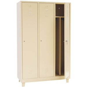 Garderobekast zware industrie, Type garderobekast: Met vakken en garderobe, Materiaal: Staal, Aantal kastkolommen: 3, Onderstel: Op poten, Aantal deuren: 3, Type sluiting: Met sleutel, Hoogte: 1900 mm, Breedte: 1185 mm, Breedte kolom: 400 mm, Diepte: 500 mm, Plaatstaal dikte: 7/10de, Coating: Epoxy, Kleur ombouw: Beige, Kleur deur: Beige, RAL: 1015, Geleverd gemonteerd: nee, Garderobekast gebruiksomgeving: Zware industrie, Aantal vakken/kolom: 1, Recyclebare verpakking: Ja - 100%, Gerecyclede verpakkingen: 100 %, Recyclebaar product: Ja - 100%, Gerecycled product: 20 %, Aantal vakken: 3