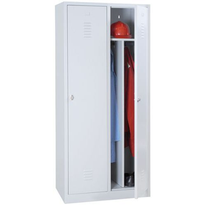 Garderobekast zware industrie, Type garderobekast: Met vakken en garderobe, Materiaal: Staal, Aantal kastkolommen: 2, Onderstel: Op sokkel, Aantal deuren: 2, Type sluiting: Met hangslot, Hoogte: 1800 mm, Breedte: 800 mm, Breedte kolom: 400 mm, Diepte: 500 mm, Plaatstaal dikte: 7/10de, Coating: Epoxy, Kleur ombouw: Lichtgrijs, Kleur deur: Lichtgrijs, RAL: 7035, Geleverd gemonteerd: ja, Garderobekast gebruiksomgeving: Zware industrie, Aantal vakken/kolom: 1, Gerecyclede verpakkingen: 100 %, Recyclebaar product: Ja - 100%, Gerecycled product: 20 %, Aantal vakken: 3