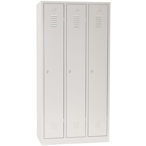 Garderobekast schone industrie, Type garderobekast: Met vakken en garderobe, Materiaal: Staal, Aantal kastkolommen: 3, Onderstel: Op sokkel, Breedte kolom: 300 mm, Type sluiting: Met hangslot, Hoogte: 1800 mm, Breedte: 885 mm, Diepte: 500 mm, Plaatstaal dikte: 7/10de, Coating: Epoxy, Kleur ombouw: Lichtgrijs, Kleur deur: Lichtgrijs, RAL: 7035, Deur RAL: 7035, Geleverd gemonteerd: ja, Garderobekast gebruiksomgeving: Lichte industrie, Aantal vakken/kolom: 1, Gerecyclede verpakkingen: 100 %, Recyclebaar product: Ja - 100%, Gerecycled product: 20 %, Aantal vakken: 2