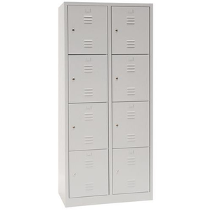 Garderobekast meervaks, Type garderobekast: Met vakken, Materiaal: Staal, Aantal vakken/kolom: 4 (speciaal voor helmen), Aantal kastkolommen: 2, Onderstel: Op sokkel, Breedte kolom: 400 mm, Aantal kubusvakken: 8, Hoogte: 1800 mm, Breedte: 800 mm, Diepte: 500 mm, Plaatstaal dikte: 7/10de, Nuttige hoogte vak: 400 mm, Nuttige breedte vak: 320 mm, Nuttige diepte vak: 475 mm, Coating: Epoxy, Kleur ombouw: Lichtgrijs, Kleur deur: Lichtgrijs, RAL: 7035, Geleverd gemonteerd: ja, Recyclebare verpakking: Ja - 100%, Gerecyclede verpakkingen: 100 %, Recyclebaar product: Ja - 100%, Gerecycled product: 20 %