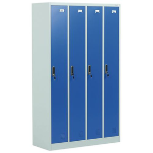 Garderobekast schone industrie 4 kolommen, Type garderobekast: Met vakken en garderobe, Materiaal: Staal, Aantal kastkolommen: 4, Onderstel: Op sokkel, Breedte kolom: 300 mm, Aantal deuren: 4, Type sluiting: Met sleutel, Hoogte: 1850 mm, Breedte: 1093 mm, Garderobe breedte: 272.5 mm, Diepte: 450 mm, Plaatstaal dikte: 6/10de, Nuttige hoogte vak: 270 mm, Nuttige breedte vak: 272.5 mm, Nuttige diepte vak: 410 mm, Coating: Epoxy, Kleur ombouw: Grijs, Kleur deur: Blauw, RAL: 7035, Deur RAL: 5005, Met schuine kappen: nee, Geleverd gemonteerd: nee, Max. belasting: 220 kg, Etikethouder: ja, Montage: Zelfbouw, Beluchting: ja, Garderobekast gebruiksomgeving: Lichte industrie, Aantal vakken/kolom: 2, Aantal legborden: 1, Gewicht: 61 kg, Deur stalen plaat diknes: 6/10de, Aantal vakken: 2, Hoogte sokkel: 101 mm, Breedte opening: 272.5 mm, Breedte sokkel: 1093 mm, Kleur frame: Lichtgrijs