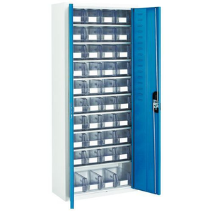 Kast met transparante magazijnbakken, Totale hoogte: 1690 mm, Totale breedte: 700 mm, Totale diepte: 300 mm, Bak kleur: Transparant, Aantal bakken: 90, Max. belasting per legbord: 50 kg, Kleur ombouw: Grijs, Kleur deur: Blauw, Deur openingstype: Klapdeur, RAL: 7035 5023, Materiaal: Staal, Lean Management: ja, Aantal legborden: 14, Model: Middelgrote kast met 90 stapelbakken van 1 l, Gebruik: Sorteren