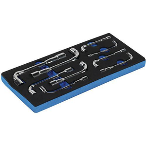 Module van foam 1/3 bestaande uit 9 pijpsleutels 6x12 vlakken, ontworpen voor krachtig vast- of losdraaien. Korte gebogen kop met 12 vlakken, en open om de sleutel door draadeinden of de uitstekende r