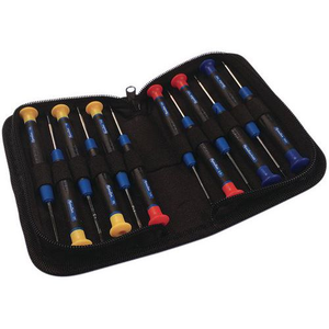 Set van 12 elektronische precisieschroevendraaiers.Ergonomische handgreep van twee materialen voor comfort en een goede ligging in de hand.Zeer robuust rond mes van chroom-vanadiumstaal met anticorros