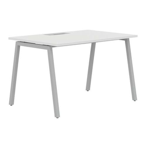 Recht bureau met boogvormige A-poten.Melamineblad van 25 mm dikte met randen van ABS van 2 mm.10 mm tussen de poten en het bureau.2 Metalen dwarsliggers voor bevestiging (40 x 20 mm) Metalen buisvormi