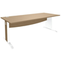 Blad van spaanplaat, dikte 25 mm, hoogte 72 cm. L-poten van massief hout met zeefdruk en stelpoten.Gebogen frontpaneel met een dikte van 16 mm voor kabeldoorgangen.