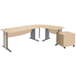 Quatuor-bureauset met hoekelement rechts of links naar keuze bij montage.Dit pakket bestaat uit een recht bureau met een breedte van 16 cm met 1 kabeldoorgang met afsluiter, een hoek van 9°, een recht