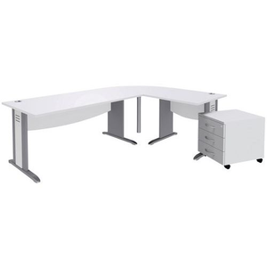 Recht bureau Quatuor L-poot met hoek en ladeblok, Type onderstel: L-poot, Totale hoogte: 72 cm, Totale breedte: 160 cm, Type bureau: Recht bureau, Type bureaublok: Bureau, Elektrisch systeem: nee, Totale diepte: 80 cm, Tafelblad materiaal: Hardboard, Onderstel kleur: Grijs, Tafelblad kleur: Wit, Productgewicht: 104.47 kg, Aantal laden: 3, Geleverd gemonteerd: nee, Selectie telewerken: nee, Recyclebare verpakking: Ja - 100%, Gerecyclede verpakkingen: 50 %, Gerecycled product: 50 %, Material des Untergestells: Spaanplaat, Eco-verantwoordelijke aanpak: ja, Model: Verrijdbaar ladeblok met 3 laden, PEFC licentie: 10-31-4128, Coating: Melamine