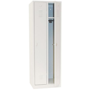 Garderobekast schone industrie, Type garderobekast: Met vakken en garderobe, Materiaal: Staal, Aantal kastkolommen: 2, Onderstel: Op sokkel, Breedte kolom: 300 mm, Type element: 1 basis + 1 aanbouw, Aantal deuren: 2, Type sluiting: Met hangslot, Hoogte: 1800 mm, Breedte: 600 mm, Garderobe breedte: 240 mm, Diepte: 500 mm, Plaatstaal dikte: 6/10de, Coating: Epoxy, Kleur ombouw: Lichtgrijs, Kleur deur: Grijs, RAL: 7035, Deur RAL: 7035, Configureerbaar: ja, Met schuine kappen: nee, Geleverd gemonteerd: nee, Montage: Zelfbouw, Beluchting: ja, Garderobekast gebruiksomgeving: Lichte industrie, Aantal vakken/kolom: 2, Aantal legborden: 2, Deur stalen plaat diknes: 6/10de, Aantal vakken: 2