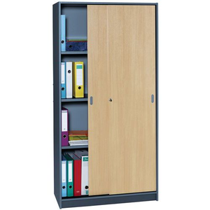 Schuifdeurkast, Totale hoogte: 180 cm, Totale breedte: 90 cm, Kleur ombouw: Antraciet, Model: Schuifdeuren, Type: Kantoorkast, Aantal legborden: 3, Totale diepte: 44 cm, Materiaal: Spaanplaat, Montage: Zelfbouw, Eco-verantwoordelijke aanpak: ja, PEFC licentie: 10-31-1649, Kleur deur: Beuken