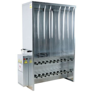 Zeer praktisch op industriƫle plekken! Droogkast voor collectief gebruik met een warmelucht-ventilatiesysteem. Bovenste gedeelte hangkast, gesloten door een kunststof strokengordijn. Onderste gedeelte: open drooggedeelte van 2 niveaus voor 10 paar schoenen. Garderoberek met stevige, duurzame constructie van gegalvaniseerd gelast staal.
