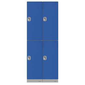 Kunststof garderobekast meervaks Twinco, Type garderobekast: Met vakken, Materiaal: Polystyreen, Aantal vakken/kolom: 2, Aantal kastkolommen: 2, Onderstel: Op sokkel, Breedte kolom: 380 mm, Aantal deuren: 4, Type sluiting: Met sleutel, Hoogte: 712 mm, Breedte: 760 mm, Diepte: 500 mm, Nuttige hoogte vak: 316 mm, Nuttige breedte vak: 380 mm, Nuttige diepte vak: 500 mm, Kleur ombouw: Grijs, Kleur deur: Blauw, Geleverd gemonteerd: nee, Montage: Zelfbouw, Min. gebruikstemperatuur: -40 °C, Hoogte sokkel: 80 mm