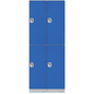 Kunststof garderobekast meervaks Twinco, Type garderobekast: Met vakken, Materiaal: Polystyreen, Aantal vakken/kolom: 2, Aantal kastkolommen: 2, Onderstel: Op sokkel, Breedte kolom: 380 mm, Aantal deuren: 4, Type sluiting: Met sleutel, Hoogte: 1028 mm, Breedte: 760 mm, Diepte: 500 mm, Nuttige hoogte vak: 474 mm, Nuttige breedte vak: 380 mm, Nuttige diepte vak: 500 mm, Kleur ombouw: Grijs, Kleur deur: Blauw, Geleverd gemonteerd: nee, Montage: Zelfbouw, Min. gebruikstemperatuur: -40 °C, Hoogte sokkel: 80 mm