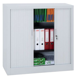 Lage roldeurkast set, Totale hoogte: 100 cm, Totale breedte: 100 cm, Deur openingstype: Met roldeur, Type sluiting: Met sleutel, Kleur ombouw: Lichtgrijs, Totale diepte: 45 cm, Type product: Lage kast, Kleur deur: Lichtgrijs, Max. belasting per legbord: 60 kg, Materialen: Staal, Aantal legborden: 2, Coating: Epoxy, Plaatstaal dikte: 7/10de, RAL: 7035, Geleverd gemonteerd: nee, Montage: Zelfbouw, Recyclebare verpakking: Ja - 100%, Gerecyclede verpakkingen: 100 %, Recyclebaar product: Ja - 100%, Gerecycled product: 20 %, Nuttige diepte: 37.5 cm, Aantal deuren: 2, Front kleur: Lichtgrijs, Brandveiligheid: M1