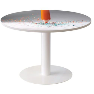 Vergadertafel Easy Office rond, kleur: decoratie, Type onderstel: Centrale, Hoogte: 75 cm, Breedte: 115 cm, Vorm: Rond, Tafelblad materiaal: Gemelamineerd, Tafelblad kleur: Bont gekleurd, Vermogen (aantal personen): 3, Onderstel kleur: Wit, Rand materiaal: ABS, Totale breedte: 115 cm, Selectie telewerken: nee, Recyclebare verpakking: Ja - 100%, Recyclebaar product: Ja - 100%, Onderstel materiaal: Metaal, Model: Decor potlood, Type: Vaste vergadertafel, Dikte tafelblad: 25 mm