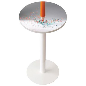 Hoge vergadertafel Easy Ø 60 cm, blad met decoratie, Type onderstel: Centrale, Hoogte: 110 cm, Breedte: 60 cm, Vorm: Rond, Tafelblad materiaal: Gemelamineerd, Tafelblad kleur: Bont gekleurd, Vermogen (aantal personen): 2, Onderstel kleur: Wit, Bovenste blad Ø: 60 cm, Selectie telewerken: nee, Recyclebare verpakking: Ja - 100%, Recyclebaar product: Ja - 100%, Onderstel materiaal: Staal, Model: Decor potlood, Dikte tafelblad: 25 mm