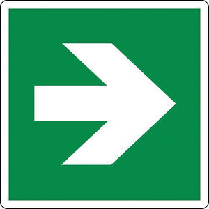 Evacuatiepictogram met pijl die de evacuatierichting aangeeft voor noodgevallen. Te verlijmen op elk glad, schoon en ontvet oppervlak. Gelamineerde polymeer: beschermt de opdruk tegen fysieke schade en filtert een deel van de uv-straling.