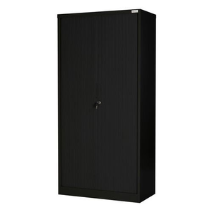 Schuifdeurkast Aris, Totale hoogte: 1850 mm, Totale breedte: 900 mm, Deur openingstype: Schuifdeur, Type sluiting: Met sleutel, Kleur ombouw: Zwart, Totale diepte: 450 mm, Kleur deur: Zwart, Max. belasting per legbord: 200 kg, Aantal legborden: 4, Montage: Zelfbouw, Materiaal: Staal, Aantal deuren: 2