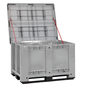 Palletkist met deksel conform ADR/UN, Totale inhoud: 610 L, Max. belasting: 510 kg, Totale hoogte: 840 mm, Totale breedte: 1000 mm, Totale lengte: 1200 mm, Gebruik voor voedsel: ja, Kleur: Lichtgrijs, Model: Dicht, met deksel met 2 scharnieren , Pallet basis: 3 zolen, Max. dynamisch draagvermogen: 510 kg, Max. statisch draagvermogen: 4800 kg, Materiaal: Polyethyleen met hoge dichtheid, Nuttige hoogte: 580 mm, Nuttige breedte: 910 mm, Gewicht: 53 kg, Min. gebruikstemperatuur: -20 °C, Nuttige lengte: 1110 mm