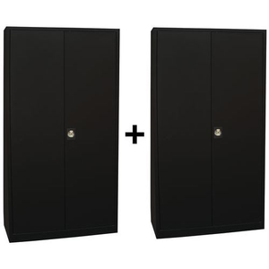 Set van 2 draaideurkasten, Totale hoogte: 195 cm, Totale breedte: 92.5 cm, Deur openingstype: Klapdeur, Kleur deur: Zwart, Kleur ombouw: Zwart, Totale diepte: 42.2 cm, Aantal legborden: 4, Model: Hoge kast, Coating: Epoxy, Max. belasting per legbord: 60 kg, RAL: 9005, Meubellijn: Manutan Orel, Geleverd gemonteerd: ja, Materiaal: Staal, Recyclebare verpakking: Ja - 100%, Gerecyclede verpakkingen: 100 %, Recyclebaar product: Ja - 100%, Gerecycled product: 20 %, Type sluiting: Met sleutel