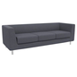 Chromen poten voor een sober design Florin 3-zitsbank in M1 brandwerende stof.Vormvast zitkussen van polyurethaanschuim.Armleuningen hoogte 25 cm.Structuur van massief sparren- en spaanplaat en beuken multiplex.