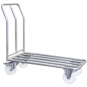 Plateauwagen voor voedsel- of chemischeindustrie RVS -400 kg, Max. belasting: 400 kg, Totale hoogte: 930 mm, Totale breedte: 518 mm, Totale lengte: 1100 mm, Aantal plateaus: 1, Nuttige lengte plateau: 1000 mm, Nuttige breedte plateau: 518 mm, Type wiel: 2 vast + 2 zwenkwiel met rem, Wiel loopvlak: Nylon, Zwenkwiel Ø: 160 mm, Onderstel materiaal: RVS 304 L, Plateau materiaal: RVS 304 L, Gewicht: 17 kg