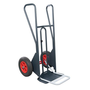 Steekwagen gesloten handgrepen 350 kg met grote lekvrije wielen, Max. belasting: 350 kg, Totale hoogte: 1330 mm, Wiel loopvlak: Lekvrije band, Diameter wiel: 400 mm, Type schep: Gemengd, H vorkframe: 945 mm, Breedte vaste schep: 490 mm, Diepte vaste schep: 180 mm, Breedte uitklapbare schep: 350 cm, Diepte uitklapbare schep: 345 cm, Totale breedte: 661 mm, Totale diepte: 853 mm, Gewicht: 21 kg, RAL: 3002, Materiaal: staal