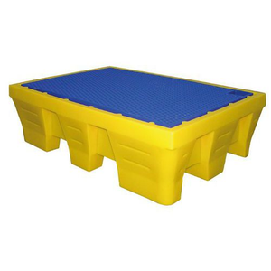 Opvangpallet met rooster, Inhoud opvangbak: 240 L, Kleur: Geel, Vermogen (aantal vaten): 2, Max. statisch draagvermogen: 500 kg, Totale breedte: 910 mm, Totale hoogte: 380 mm, Totale lengte: 1310 mm, Rooster materiaal: Geplastificeerd, Gewicht: 46 kg, Roostermat: ja, Materiaal: Polyethyleen, Recyclebare verpakking: Ja - 100%, Recyclebaar product: Ja - 100%, Zuurbestendig: ja, Waterige oplossing: ja