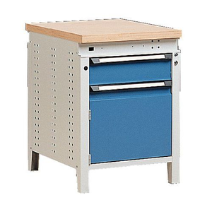 Functionele werkbank van staal met kast en lade voor in de werkplaats. Voorzien van uitsparingen voor snoeren en persluchtslangen. Met gaten aan de zijkant voor het ophangen van accessoires. Berg uw spullen veilig op in de kast en in de lade met centrale vergrendeling. Stroom- en persluchtvoorziening apart te bestellen. Wordt gemonteerd geleverd.