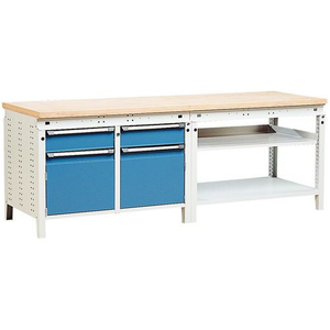 Werkbank Function 230 met legborden, kasten en laden, Max. belasting: 1500 kg, Totale hoogte: 850 mm, Totale breedte: 2300 mm, Werkbank blad materiaal: Beuk multiplex, Totale diepte: 750 mm, Type: 304SP, Model: D, Dikte tafelblad: 40 mm, Aantal laden: 2, Aantal legborden: 2, Hoogte lade: 150 mm, Aantal deuren: 0, Aantal kasten: 2, Max. belasting lade: 80 kg, Special Covid-19: nee, Recyclebare verpakking: Ja - 100%, Recyclebaar product: Ja - 100%, Gewicht: 136 kg, Totale hoogte kast: 420 mm, Totale breedte kast: 420 mm