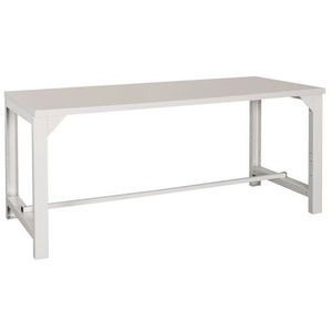 Extra brede werkbank voor in de werkplaats. Voorzien van uitsparingen voor doorvoer van stroom- en persluchtvoorziening. Met voetensteun voor extra stabiliteit. Opgelet: vergeet niet om uw materiaal voor elektrische voeding en perslucht te bestellen.