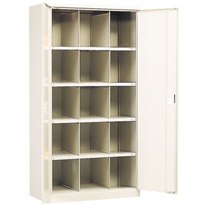 Draaideurkast 1000, Max. belasting: 1000 kg, Materiaal: Staal, Totale hoogte: 1950 mm, Totale breedte: 1005 mm, Aantal legborden: 4, Totale diepte: 445 mm, Type: Hoge kast, Max. belasting per legbord: 100 kg, Kleur deur: Grijs, Frame kleur: Grijs, Aantal vakken/kolom: 15, RAL: 7035, Geleverd gemonteerd: ja, Recyclebare verpakking: Ja - 100%, Recyclebaar product: Ja - 100%, Aantal deuren: 2