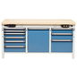 Compleet uitgevoerde, brede werkbank voor in de werkplaats. Voorzien van 2 elektrische en 2 pneumatische aansluitingen. Met gaten aan de zijkant voor het ophangen van praktische accessoires. Berg uw spullen veilig op met de centraal afsluitbare laden. Met afsluitbare kast voor uw grotere materialen. Wordt gemonteerd geleverd.
