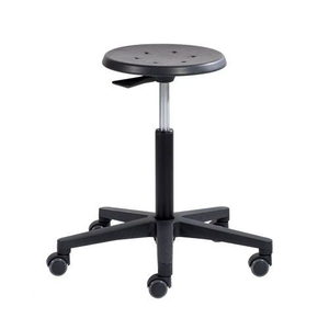 Ronde zitting van polyurethaan, diameter 340 mm, met perforaties die ademen mogelijk maken. Hoogteverstelling van de zitting van 38 tot 52 cm door middel van een gaslift, geregeld door een ronde hendel onder de zitting, bereikbaar over de gehele omtrek. Op wielen voor meer mobiliteit.