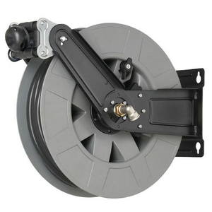 Automatische oproller. gamma YP9 - Geleverd ZONDER SLANG - max. 20 bar - Voor lucht water (-15 °C/+50 °C) - 1/2 F inlaataansluitingen, Vaste beugel staal epoxy, optionele draaibare flens - Afneembare ratel - Wand-, vloer- of plafondmontage - Verstelbare kabelgeleider - Grijze open ABS behuizing - Optionele inlaatslang - Afmetingen: H 425 x B 480 x D 225